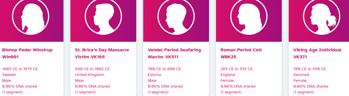 According to my DNA results, my matches link to a Bronze Age steppe dweller in Kazakhstan (1400 to 900 BCE), an Iron Age Tagar in Russia (1000 to 800 BCE), a Roman Celt in England (265 to 539 CE), and Viking warriors in Sweden and Denmark (816 to 1200 CE). A Vendel Period seafarer in Estonia (700 to 800 CE), a Danish victim of the St. Brice’s Day massacre in the UK (880 to 1002 CE), and a Late Antique Roman in Italy (400 to 600 CE) all weave into my lineage. Their faint 0.06 to 0.08% DNA matches confirm shared ancestors 20 to 50 generations back.