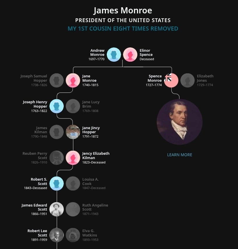 I’m also a distant cousin to many United States Presidents: 1st cousin 8 times removed to James Monroe, 3rd cousin 7 times removed to Abraham Lincoln, 4th cousin 7 times removed to Thomas Jefferson, 8th cousin 6 times removed to George Washington, 7th cousin 7 times removed to John Adams, and many more, connecting me to a majority of U.S. presidents (over 28).