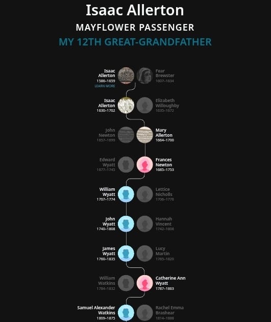 My father’s line descends from Mayflower passengers: Isaac Allerton and Henry Samson (12th great-grandfathers) and William and Mary Brewster (13th great-grandparents), steadfast spiritual beacons who printed forbidden books. Ancestry calculations suggest I’m 80% old American stock with 20% English-Irish-Scottish and Swiss-German roots. With so much American history tied to my ancestors, I had many more cousins than I had realized.